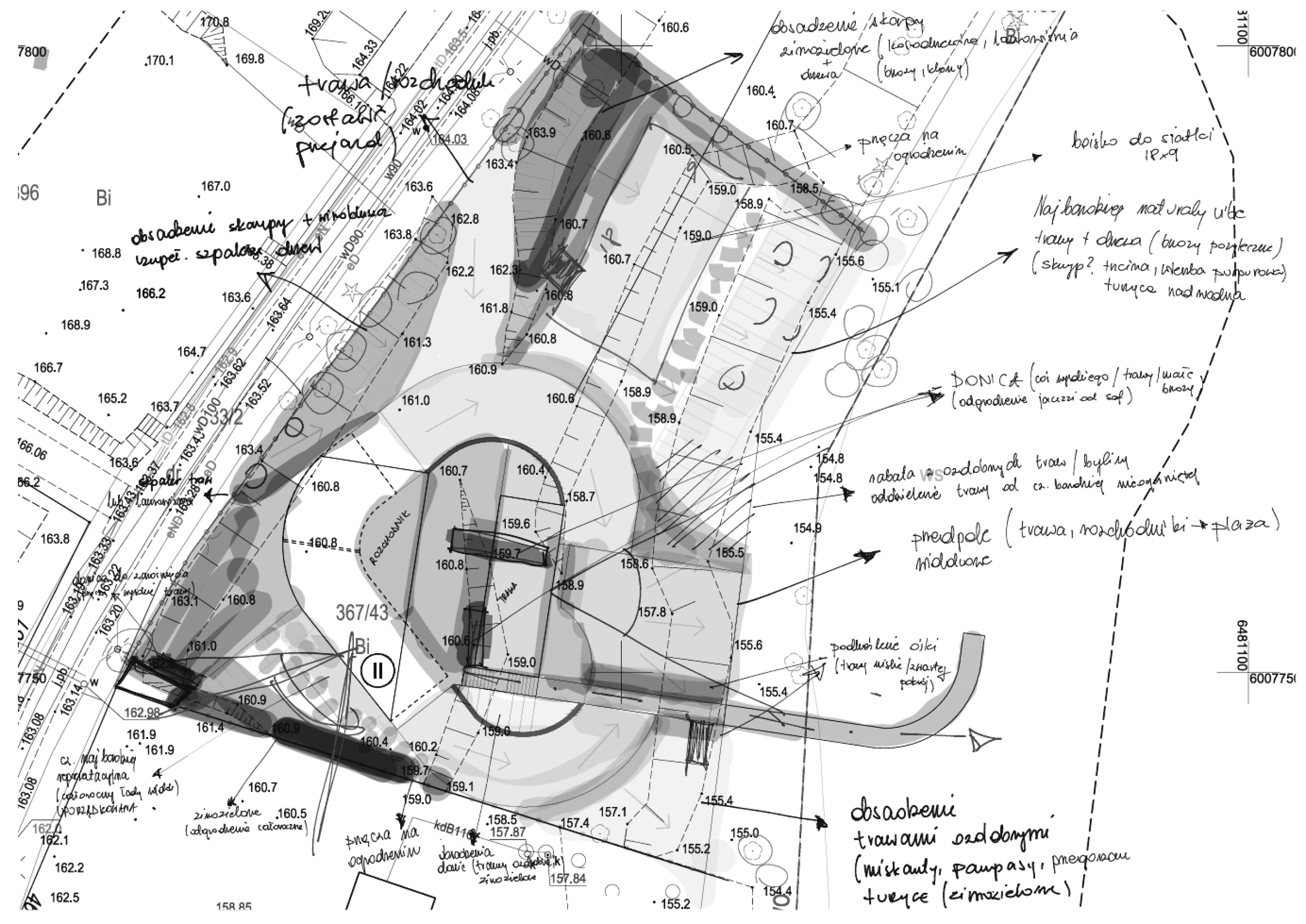 Od strony wejściowej tworzy spójną, spokojną strefę reprezentacyjną, a od strony wody – miękkie, naturalne tarasy o zróżnicowanym charakterze. Z wyższych partii teren schodzi stopniowo w kierunku brzegu, a zaprojektowane pochylnie z trawy wzmocnionej geokratą tworzą geometryczne, symetryczne kręgi, wokół których rozwijają się wrzosowiska i rabaty o naturalnym, preriowym charakterze.