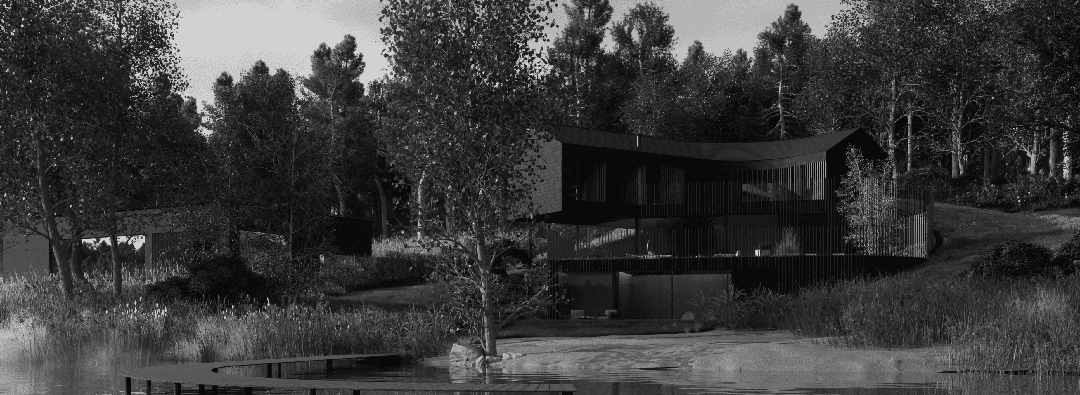 Towarzysząca mu nowoczesna architektura o tarasowej strukturze – wykończona egzotycznym drewnem i łupkiem – zamyka się od strony drogi, a otwiera ku jezioru.