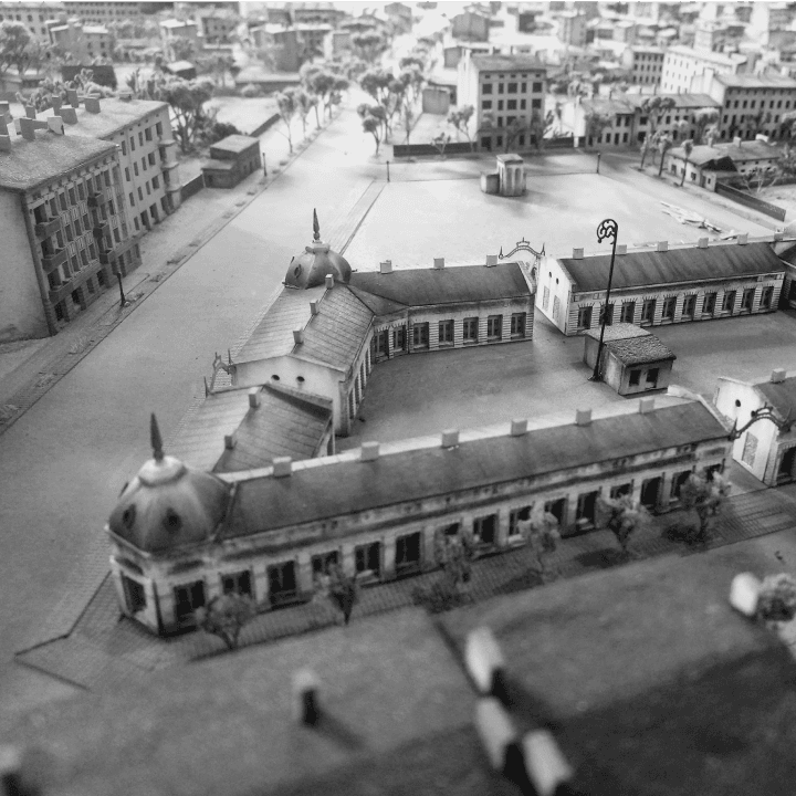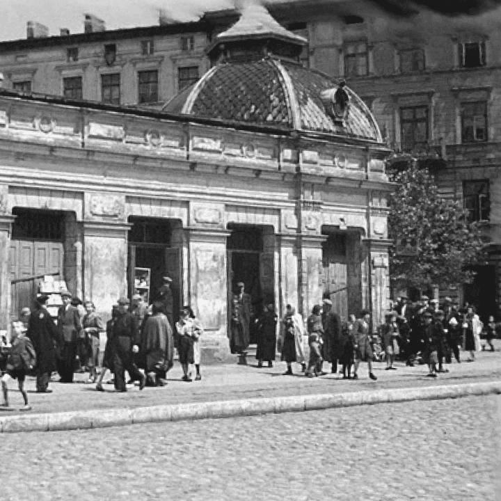 Hala targowa powstała w 1902 roku jako część kompleksu targowiska na ówczesnym placu Bazarowym (dziś Piastowskim). Budynek, zaprojektowany przez Dawida Landego na zlecenie barona Giuseppe Tanfaniego, był jednym z najnowocześniejszych obiektów handlowych początku XX wieku. Zespół czterech pawilonów tworzył regularny układ czworoboczny, dopasowany do formy placu, z wewnętrznym dziedzińcem i charakterystyczną lampą oświetlającą całą przestrzeń.