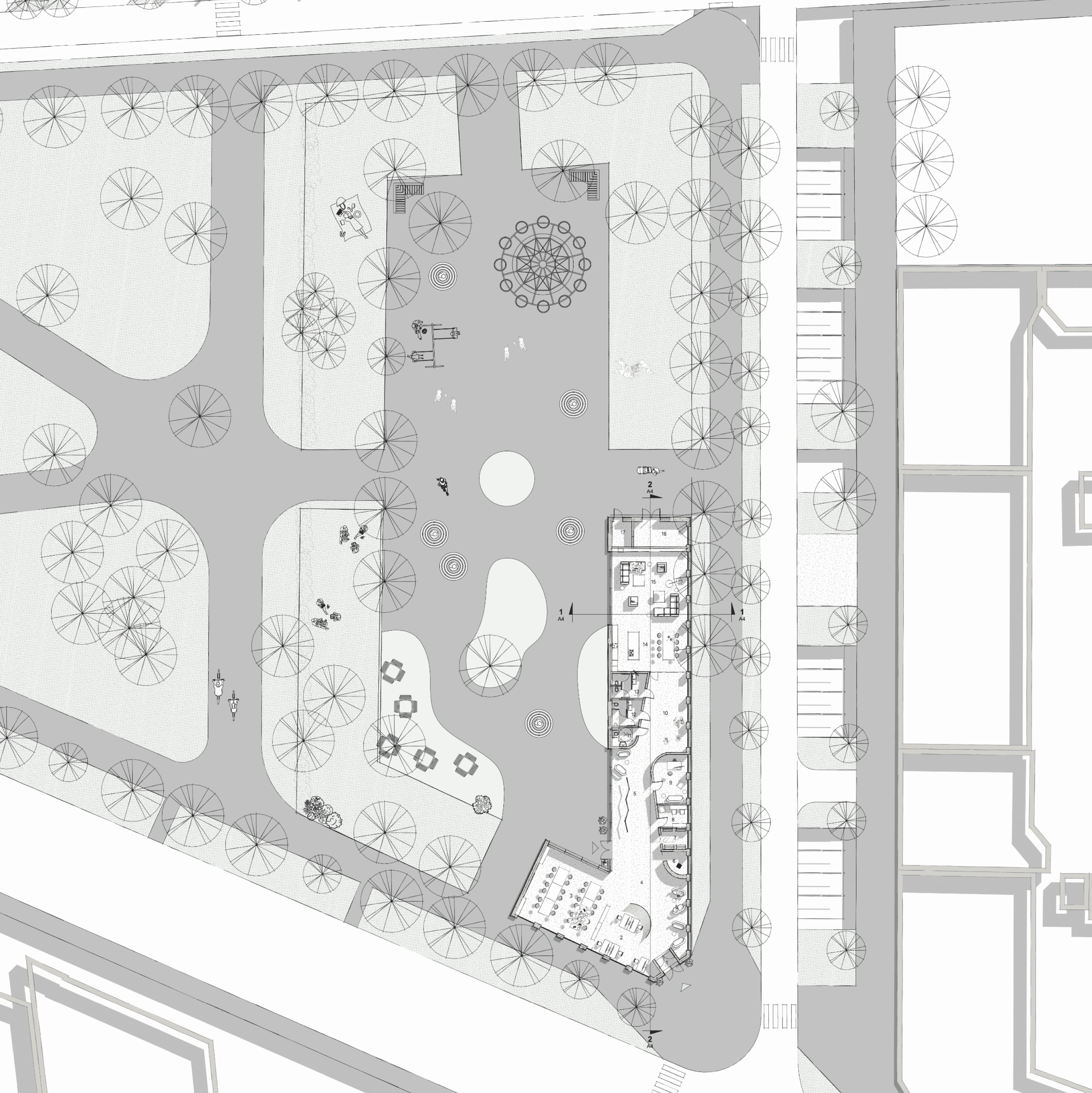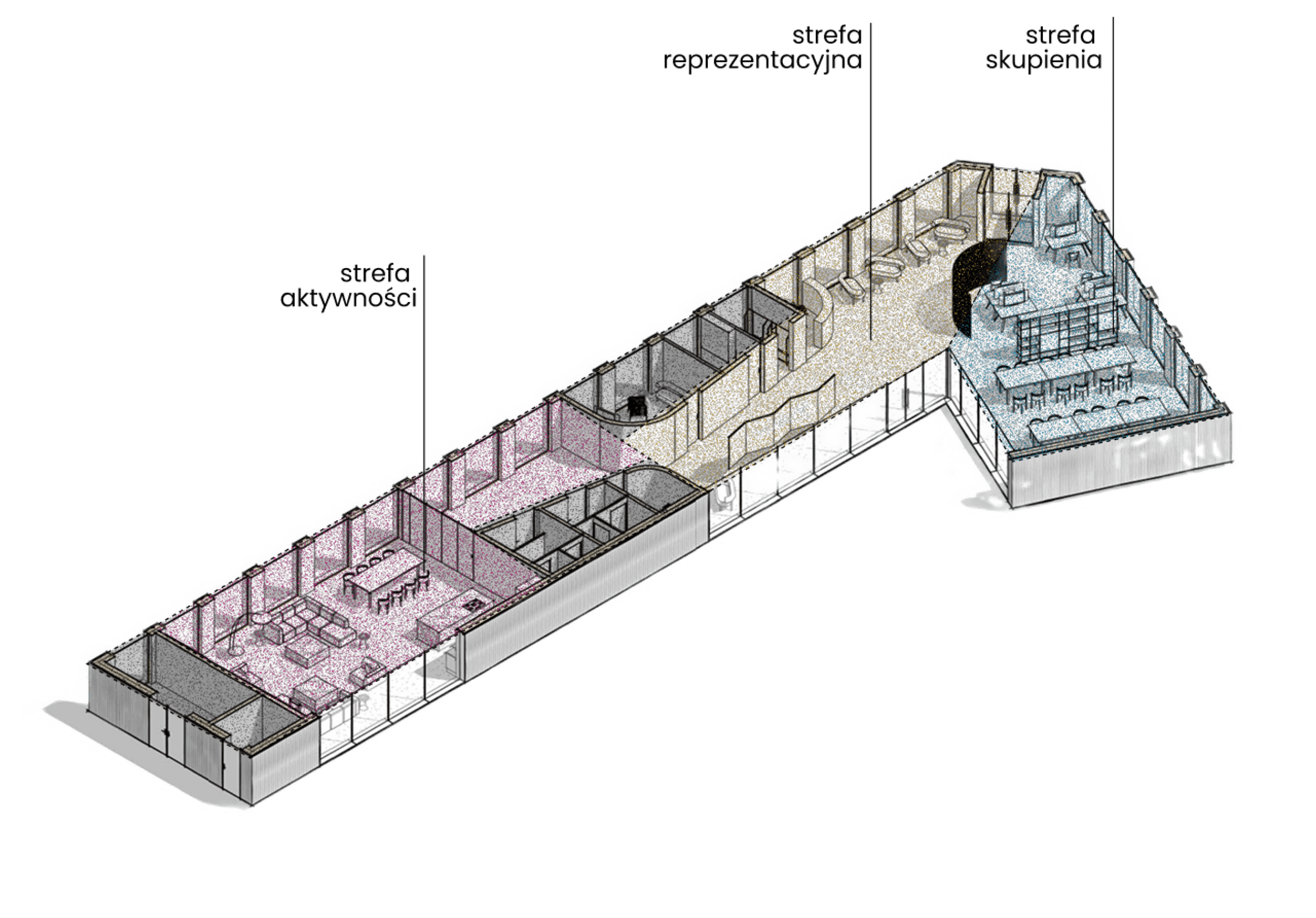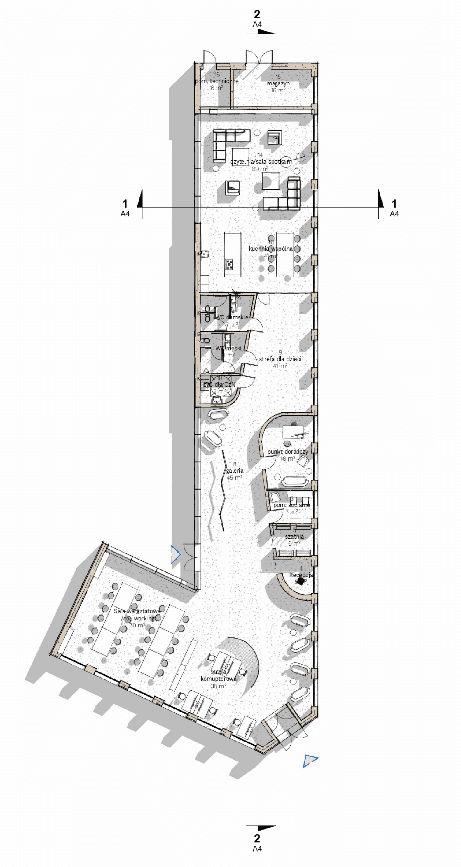 Dom sąsiedzki został zaplanowany z wyraźnym podziałem na trzy strefy użytkowe: strefę aktywności, reprezentacyjną oraz strefę skupienia. Taki układ przestrzenny pozwala na jednoczesne funkcjonowanie różnych grup użytkowników – od najmłodszych spędzających czas w strefie dla dzieci, przez seniorów uczestniczących w spotkaniach, po osoby korzystające z przestrzeni do cichej nauki. Lokalizacja wejść, zaplecza technicznego i sanitariatów została tak przemyślana, by poszczególne strefy mogły działać niezależnie i nie kolidować ze sobą.