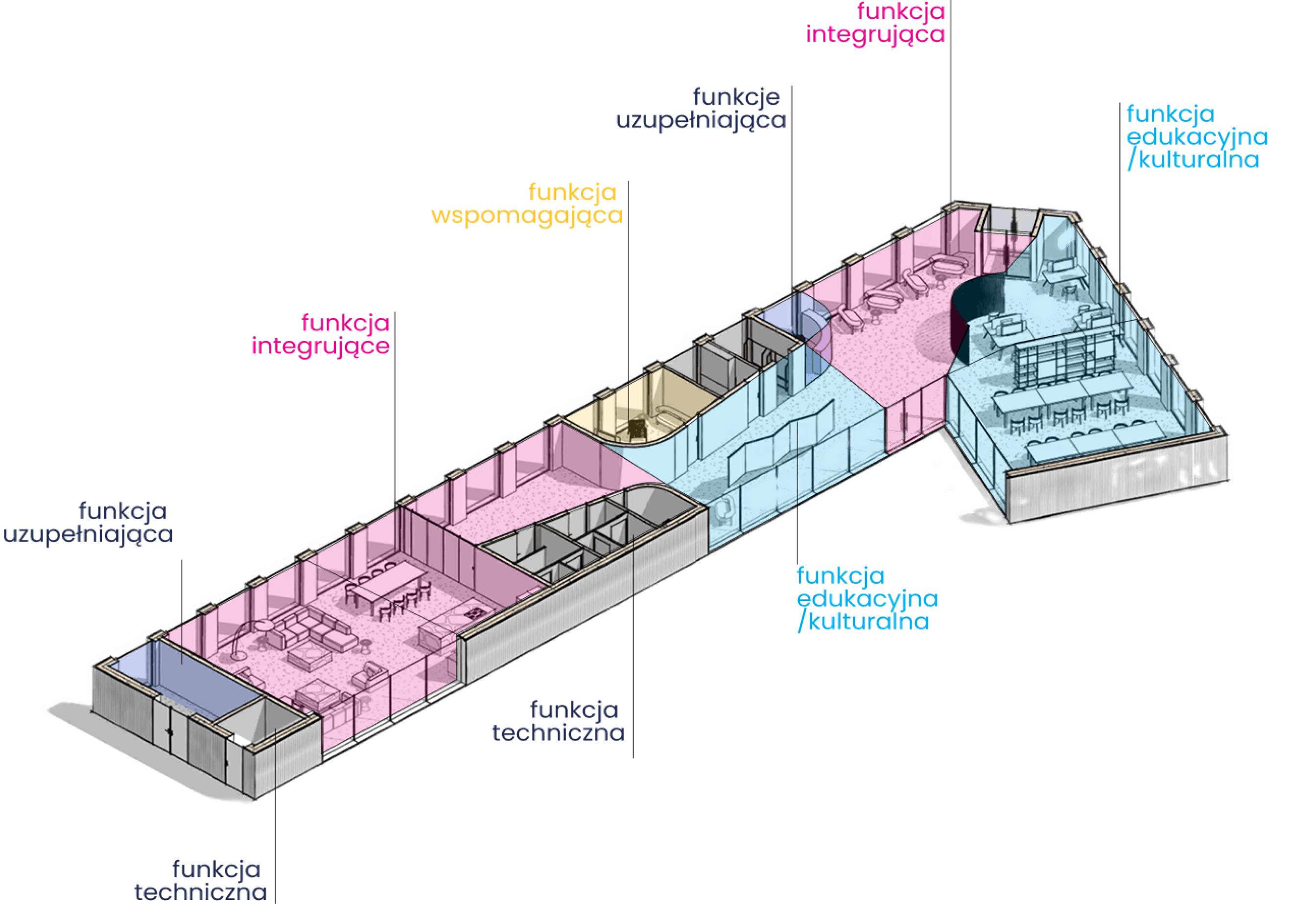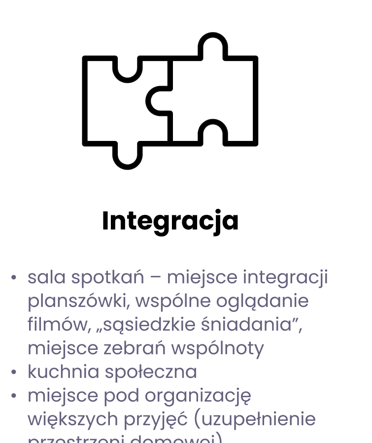 Program domu sąsiedzkiego opiera się na pięciu komplementarnych funkcjach. Funkcja integrująca obejmuje m.in. salę spotkań i kuchnię społeczną, umożliwiające organizację wspólnych posiłków, gier planszowych czy zebrań wspólnotowych. Funkcja edukacyjno-kulturalna to przestrzeń warsztatowa, komputerowa czy czytelnia społeczna, wspierająca edukację i przeciwdziałająca wykluczeniu cyfrowemu. Funkcje wspierające obejmują punkt doradczy, miejsce dyżurów ekspertów oraz strefę informacji lokalnej. Wsparcie techniczne zapewnia dostęp do wypożyczalni narzędzi i rowerów, a funkcje uzupełniające – zaplecze socjalne, szatnię, recepcję i sanitariaty – umożliwiają sprawne funkcjonowanie całego budynku.